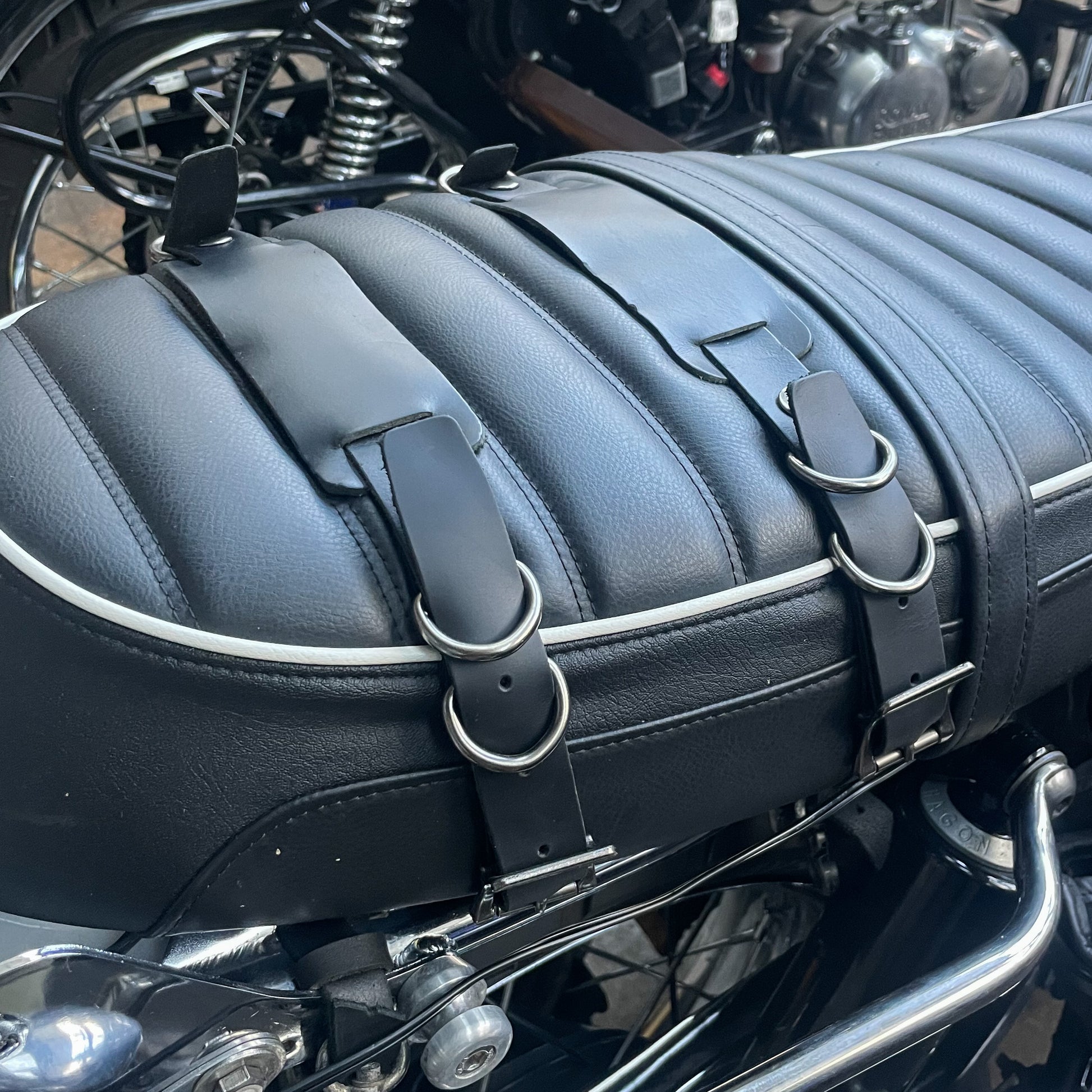 These 100% real leather straps are designed to wrap around the rear section of your seat and provide attachment points in the form of two metal hoops on either side. With these hoops, you can attach your panniers or bags via clasps, carabiners, or any other means that you think will work.